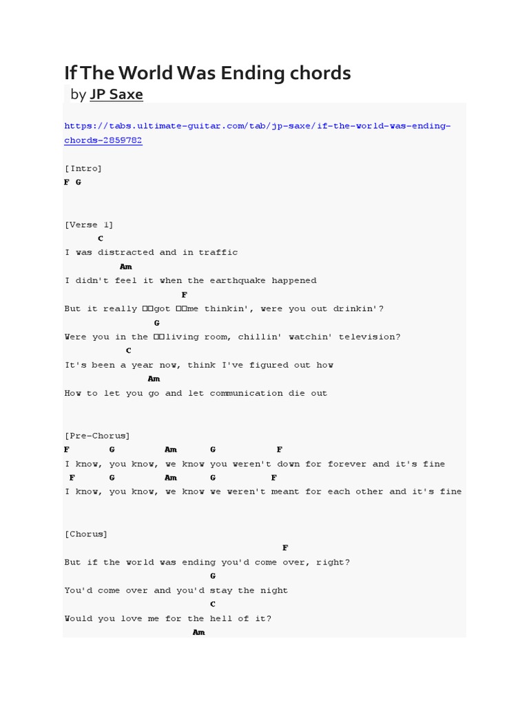 . Youd come over and youd G stay the. G Youd come over and youd stay the night C Would you love me for the hell of. Interactive chords for JP Saxe - If The World Was Ending ft Julia Michaels.